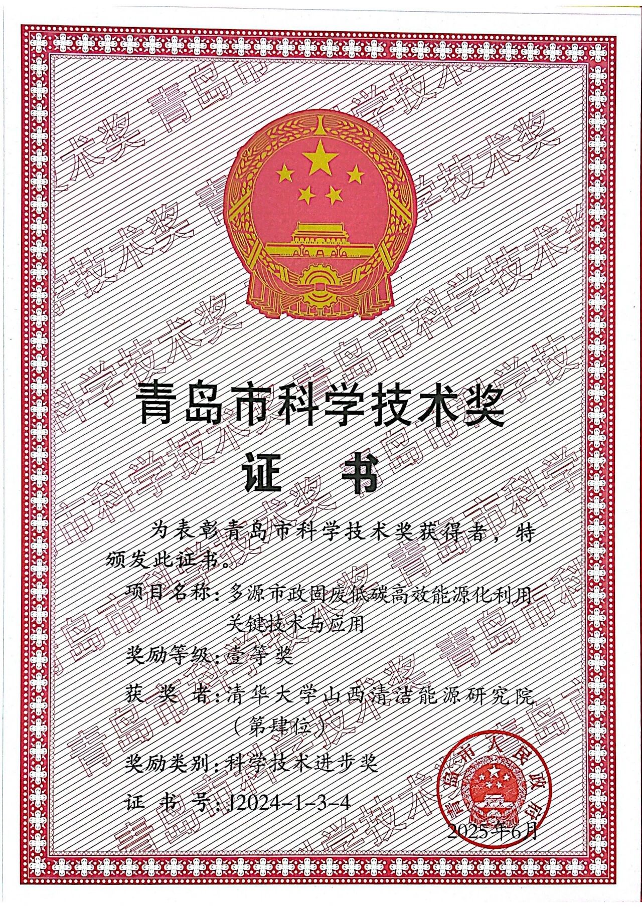 近日,青岛市科技创新大会揭晓 2024 年度科学技术奖,由青岛西海岸公用事业集团牵头,清华大学山西清洁能源研究院碳中和研究所参与完成的 “多源市政固废低碳高效能源化利用关键技术与应用” 项目荣膺一等奖。该项目通过产学研深度协同,破解了多源市政固废处置的技术瓶颈,形成具有自主知识产权的成套技术体系,其关键技术经能源与环境领域权威专家鉴定达到 “国际领先水平”。