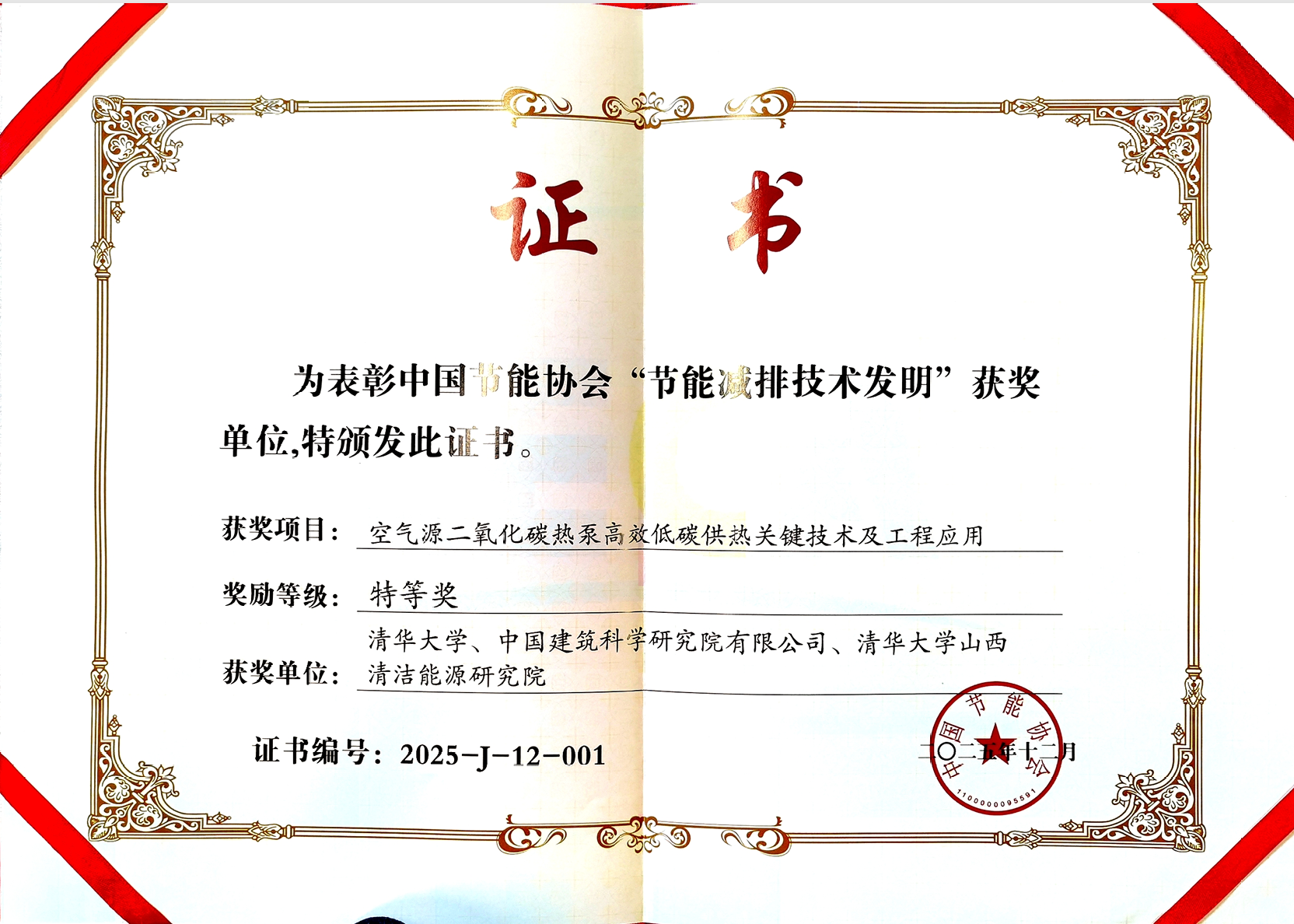 近日,2025年中国节能协会创新奖获奖名单揭晓,由清华大学牵头,中国建筑科学研究院有限公司、清华大学山西清洁能源研究院(简称清华山西院)联合完成的《空气源二氧化碳热泵高效低碳供热关键技术及工程应用》项目,荣获“中国节能协会节能减排技术发明奖”特等奖。